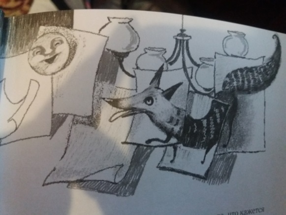 Отдельное внимание стоит уделить иллюстрациям Анастасии Балатенышевой. Главная функция иллюстраций – это отразить основную суть текста и помочь с его восприятием. Я считаю, что Анастасия Балатенышева прекрасно справилась со своей работой, так как, во-первых, ее иллюстрации написаны глазами собаки, например: на странице 7 у работника очень большой ботинок, статуя написана, как если бы мы с вами сидели на корточках; во-вторых эти иллюстрации на протяжении всей книги передают атмосферу, в которой находится главный герой, например: на странице 65 изображены очень большие головы людей, это передает атмосферу давления, которое испытывает на момент повествования Мох.