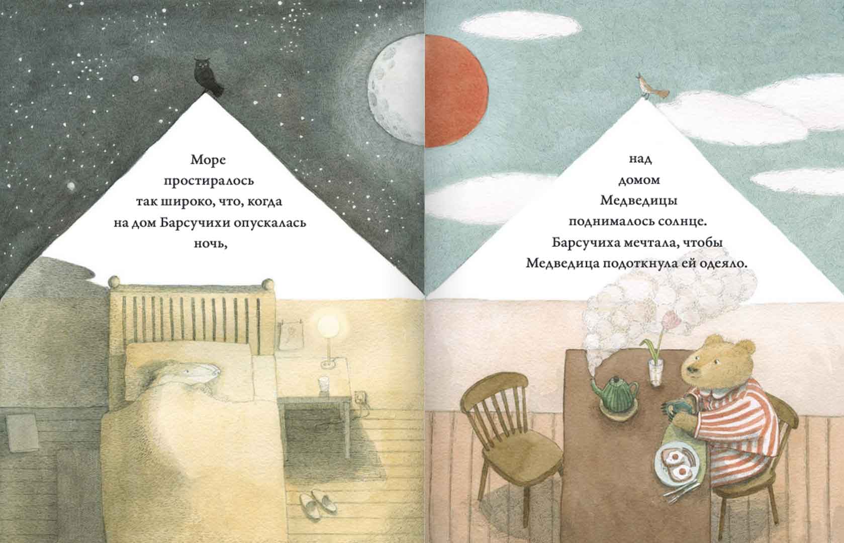 Барсучиха и Медведица живут далеко друг от друга. Когда Барсучиха ложиться спать, у Медведицы встаёт солнце. Их разделяет бескрайнее море, но они умеют мечтать вместе и в телефонных разговорах обсуждают как прошёл день. Море в книге не просто часть океана. Море как полноправный герой. Оно учит Барсучиху видеть красоту природы, необычные предметы, находить новых друзей. Море показывает, что расстояние между берегами не имеет значения для дружбы.