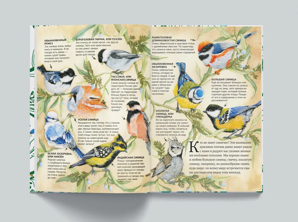 В книге художника-натуралиста Анны Юдиной воробьи и синицы представлены не только во всём разнообразии, но и со всеми своими птичьими родственниками. Рассказано, где птицы живут, как устроены их гнёзда, чем они питаются, как себя ведут. Ещё здесь – удивительные цифры и факты, достоверность которых подтвердили учёные-орнитологи – консультанты книги. Реалистично изображённых птиц художница «нарядила» в шапочки, шарфики, воротнички – это очень забавно. А вы знали, что в шейке воробья позвонков в два раза больше, чем в шее жирафа?!