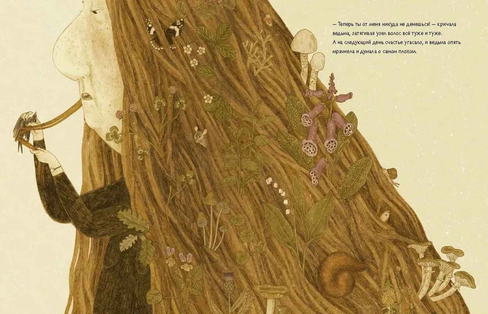В философской сказке писательницы Лизы Биджи и художницы Моники Баренго злая ведьма пытается стать счастливой, делая несчастными других. Она всегда чуяла чужое счастье – «Своими острыми когтями она в мгновение ока хватала его и туго вплетала в свои волосы». Но украденное счастье быстро угасает, и ведьма опять мрачнеет, думая о самом плохом. Сможет ли она понять в чём секрет счастья и что для этого нужно.